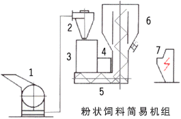 主要由粉碎機、提升機、攪拌機、料倉和配電柜組成,完成由粒狀原料的粉碎到全部原料的混合和攪拌均勻。粉狀飼料加工機組的主要工藝流程是: